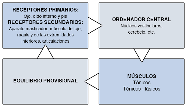 El cuerpo utiliza una serie de captores (a través de los ojos, de los pies o del oído) que envían al cerebro la información de lo que ocurre a su alrededor, el sistema nervioso central procesa todos estos datos y genera una respuesta automática para lograr el equilibrio postural.
